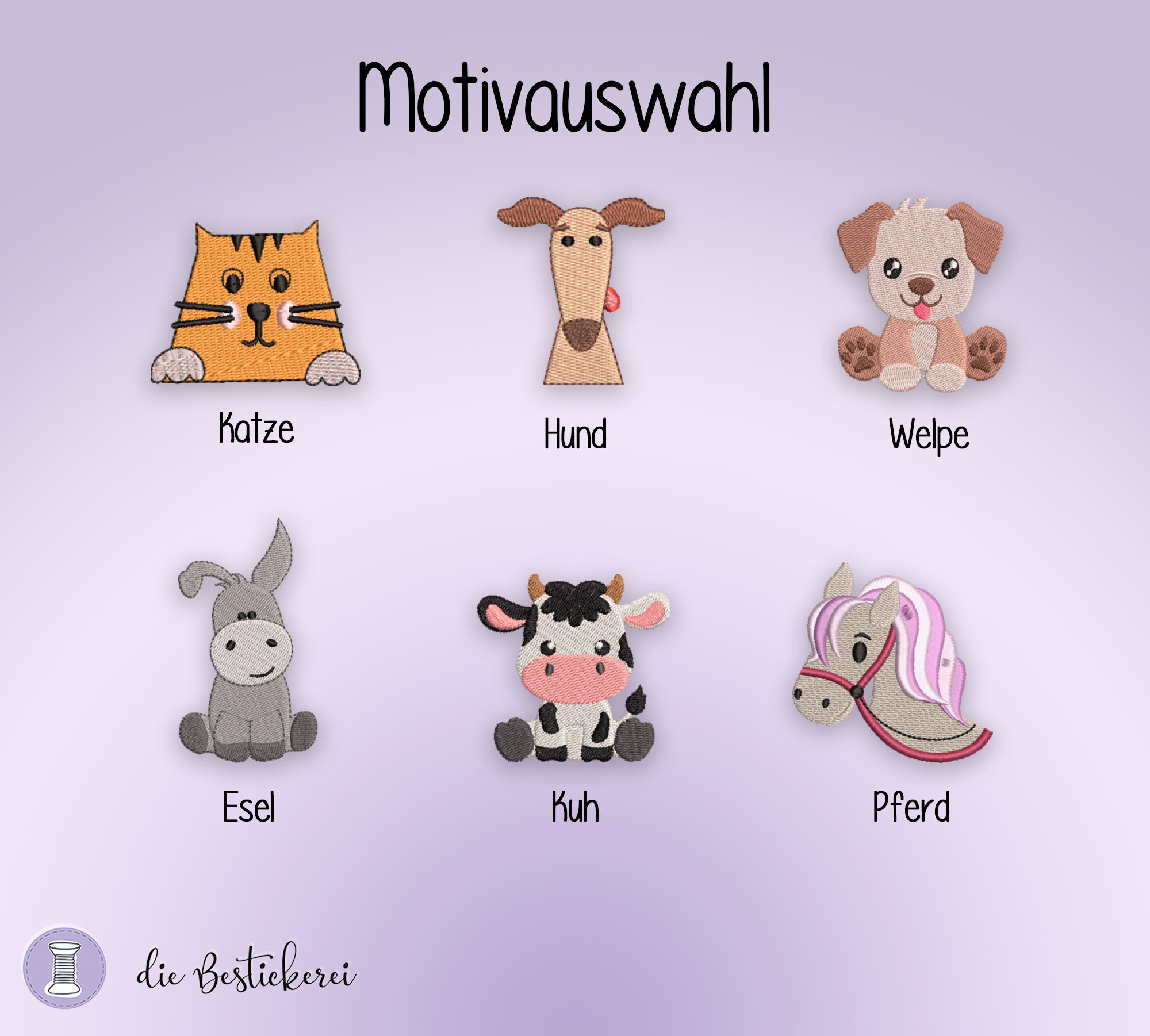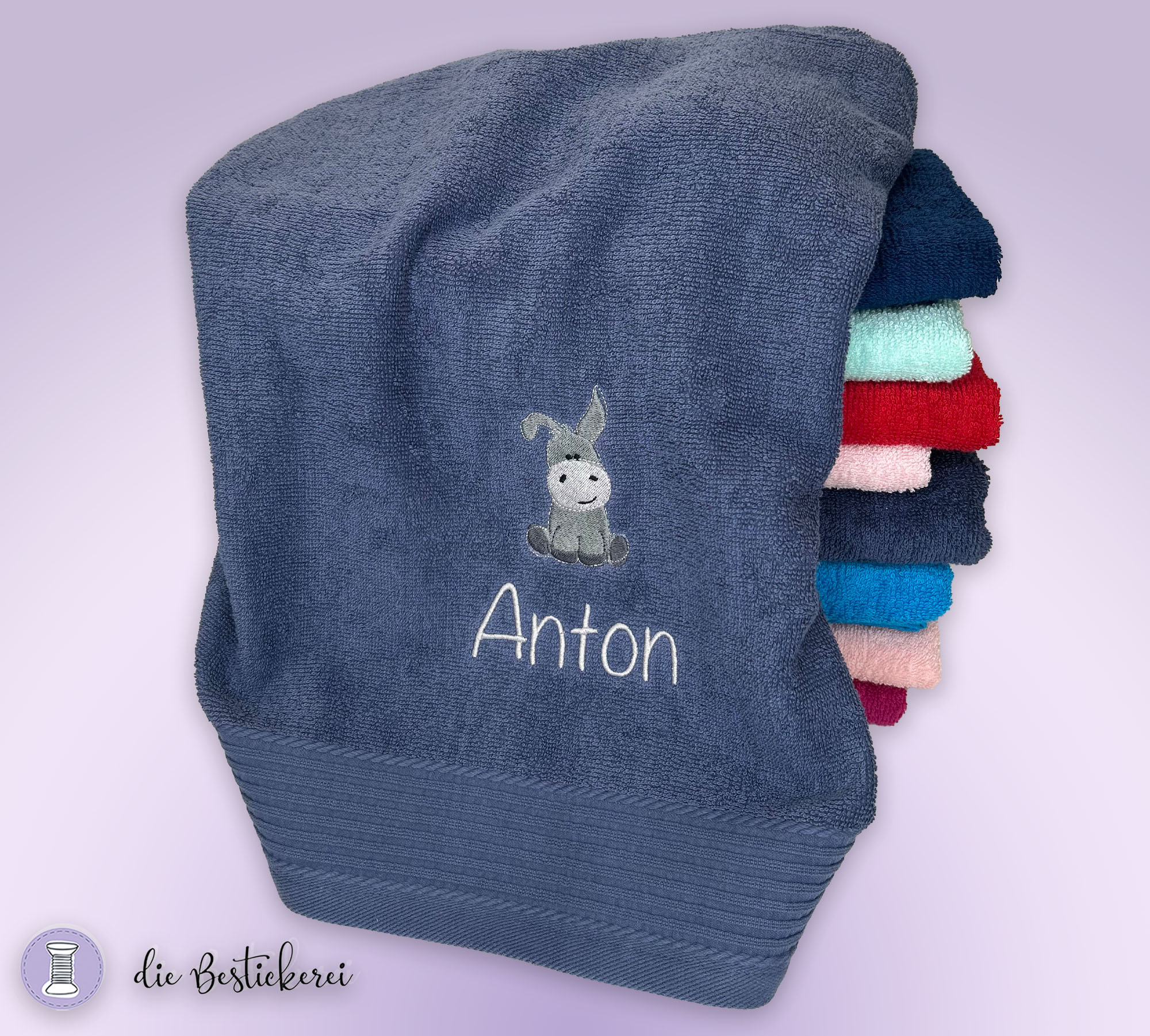 Dieses kuschelweiche Handtuch wird individuell mit deinem Wunschnamen bestickt und mit niedlichen Bauernhof-Tieren wie Esel, Kuh, Hund oder Katze verziert. Ein fröhlicher Begleiter für Kindergarten, Bad oder Urlaub!